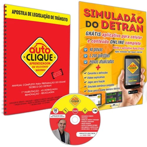 Kit aprovação na prova de legislação de trânsito - material completo para o aluno Preparatório para prova de primeira habilitação, do detran. Você que está passando pelo processo de habilitação, renovação ou recilagem para condutor infrator e quer passar na prova do detran de primeira. Adquirindo nossa apostila do aluno + apostila de provas do detran você ganha uma chave de acesso que dá direito a fazer o curso de legislação de trânsito online por 90 dias. - 1 manual 162 páginas com todo o conteúdo do curso teórico de habilitação 45 horas / aula - 1 manual com 40 provas simuladas e exercícios de fixação separados por matéria - 1 dvd com videoaulas do curso teórico - 1 chave de acesso para o App de estudos da Auto Clique. Módulos abordados nos materiais 1. Processo de habilitação; habilitação; veículos; 2. Infrações e crimes de trânsito e suas punições 3. Sinalização de trânsito 4. Normas de circulação e conduta 5. Direção defensiva 6. Primeiros socorros em acidentes de trânsito noções 7. Cidadania, convívio social e meio ambiente, no trânsito 8. Mecânica básica de veículos de 4 e 2 rodas noções - ESPECIFICAÇÕES DA APOSTILA DE PRIMEIRA HABILITAÇÃO PARA PROVA DO DETRAN Manual para primeira habilitação, completo, com excelente ilustrações que abordam todas as matérias exigidas pela legislação de trânsito e que caem na prova do detran de todos os estados. O manual é 100% atualizado O manual contém 162 páginas e aborda as seguintes disciplinas: Legislação de trânsito / infrações e penalidades / sinalização de trânsito / conduta e circulação / direção defensiva / primeiros socorros / meio ambiente e convívio social / noções de mecânica - 2 e 4 rodas. - ESPECIFICAÇÕES DO SIMULADO DE PROVAS DO DETRAN É um caderno de exercícios com 40 provas e 1.200 questões parecidas com as provas do detran. O simuladão de provas contém 92 páginas, sendo: 13 provas específicas por matéria; 27 provas completas incluindo todas as matérias; Dicas para o exame teórico-técnico; Dicionário de termos técnicos e siglas. -DVD CURSO TEÓRICO HABILITAÇÃO - VIDEOAULAS Próprio para o aluno se preparar para prova teórica do DETRAN - DVD Produzido em parceria com a Auto Clique e Professor Ronaldo Cardoso do Youtube. O DVD contém 26 videoaulas com muitas Dicas e Macetes - Completo e atualizado. São aproximadamente 5 horas/aula de video aulas + exercícios no final de cada módulo. - BÔNUS EXTRA: CHAVE DE ACESSO PARA O APP DE LEGISLAÇÃO DE TRÂNSITO DA AUTO CLIQUE Conteúdo didático: Legislação de trânsito / Infrações e penalidades / Sinalização de trânsito / Conduta e circulação / Direção defensiva / Primeiros socorros / Meio ambiente e convívio social / Noções de mecânica - 2 e 4 rodas. Jogos para fixação: Jogo da forca / jogo da memória / jogo da trivia / Jogo das placas / Quiz rally / Quiz de perguntas e respostas / Direção certa / simulador de carro em via. Vídeos: Diversos vídeos explicativos nas matérias. São vários vídeos para que você possa assimilar melhor as matérias. Simulado eletrônico: Teste os seus conhecimentos através do Simulado Eletrônico. Ele é idêntico ao do DETRAN e contém milhares de provas. São provas atualizadas de todos os estados. Em todas as provas, no final terá um gabarito para que você possa verificar o que acertou/errou. São 90 dias de acesso ilimitado ao App. Observações.: O material é 100% atualizado e revisado pelo professor e especialista em trânsito Ronaldo Cardoso. O curso não substitui a formação nas escolas, material de apoio apenas. Marca: Auto Clique Editora Ean: 0736532791412