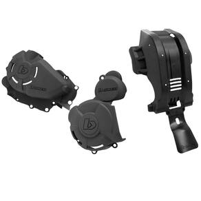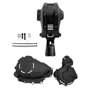 Kit proteção motor e tampas Biker tem como função proteger as partes mais importantes da moto como as tampas laterais do motor, tampa do magneto, chassi inferior, chassi frontal, link da suspensão traseira, e motor contra batidas de galhos, pedras, troncos ou eventualmente uma queda.