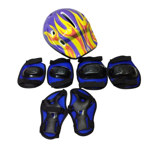 - marca: funs - modelo: kit de proteção infantil 7 peças - material: pvc, poliéster e espuma - peso: 0,120 - dimensões: 40 cm x 36 cm - produto indicado para crianças acima de 3 anos - itens inclusos: 1 capacete, 1 par de cotoveleira, 1 par de munhequeira e 1 par de joelheira Marca: Funs