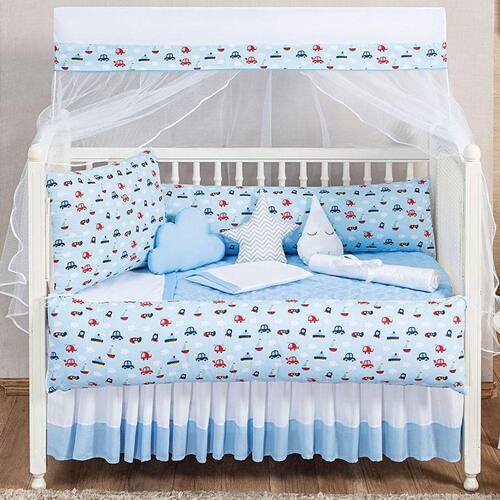 Kit Protetor Berço Carrinho Azul Menino 2 Laterais 8 Peças