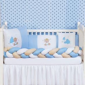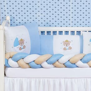 Este produto foi desenvolvido pensando no máximo conforto e bem estar do seu bebê. Por isso, ele é fabricado com materiais de alta qualidade. Tudo para garantir a segurança dos pequenos e tranquilidade para os pais.Características:- Material de alta qualidade- Produzido pensando na segurança do bebêEspecificações TécnicasProduto: Kit Protetor Berço Padrão Americano Ursinho Lua Azul 6 PçsMarca: L2MModelo: Kit para berço nacional e americanoCor: AzulGênero: MasculinoMaterial:Tecido: 70% poliéster/ 30% algodãoEnchimento 100% poliésterMosqueteiro 100% poliamidaMedidas:1 cabeceira------------------0.65x0.40 mts1 lateral -----------------------1.25x0.25mts1 trança --------------------1.25x0.12 mts1 almofada -----------------0x25x0.25 mts1 fronha ---------------------0.28x0.38 mts 1 lençol com elástico inteiro---- 130cm x 70cm x 15cmInformações importantes:O produto já vai pronto para o uso, com o enchimento já incluso.Acompanha as peças conforme a descrição, não esta incluso o berçoA cabeceira e lateral do kit possuem zíper para retirar o enchimento, facilitando assim uma possível lavagem do produto.Trança deve ser lavada a secoA saia não acompanha Marca: L2m