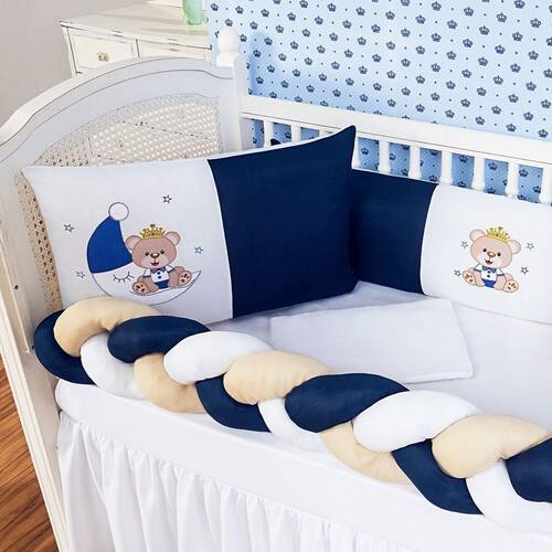 Especificações Técnicas Produto: Kit Protetor Berço Padrão Americano Ursinho Lua Marinho6 Pçs Marca: L2M Modelo: Kit para berço Nacional e Americano Cor: Azul Marinho Gênero: Masculino Material: Tecido: 70% poliéster/ 30% algodão Enchimento 100% poliéster Mosqueteiro 100% poliamida Medidas: 1 cabeceira------------------0.65x0.40 mts 1 lateral -----------------------1.25x0.25mts 1 trança --------------------1.25x0.12 mts 1 almofada -----------------0x25x0.25 mts 1 fronha ---------------------0.28x0.38 mts 1 lençol com elástico inteiro---- 130cm x 70cm x 15cm