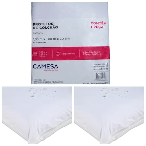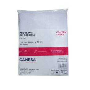 Tamanho: Casal (1,38m x 1,88m x 30cm)Fronha: 50 x 70 cm, com fecho.Cor: Branco.Material: com tecnologia super impermeável.Elástico em toda a volta para um ajuste perfeito.Composição: 100% poliéster (face superior), 100% poliuretano (face inferior), 100% poliéster (laterais)