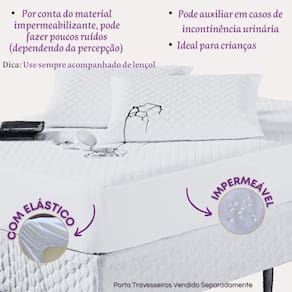 Kit protetor colchão casal + 2 capa de travesseiro impermeável + saia box branco O kit impermeável matelado é o um combo indispensável para sua cama. O protetor e o porta travesseiros impermeável irão proteger seu colchão e travesseiro de eventuais acidentes com bebidas, líquidos, sujeira em geral e também da transpiração noturna, o que poderá proporcionar maior vida útil para seu enxoval.
