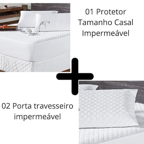 Kit Protetor Colchão Impermeável Casal +2 Capas Travesseiro O KIT IMPERMEÁVEL MATELADO é o um combo indispensável para sua cama.O protetor e o porta travesseiros impermeável irão proteger seu colchão e travesseiro de eventuais acidentes com bebidas, líquidos, sujeira em geral e também da transpiração noturna, o que poderá proporcionar maior vida útil para seu enxoval. CONTEÚDO DA EMBALAGEM- 01 Protetor de colchão CASAL: 1,88 m x 1,38 m x 40 cm- 02 Porta Travesseiros: 70 cm x 50 cm COMPOSIÇÃO TEXTIL Protetor Colchão - Tecido Superior: 100% Poliéster- Tecido Interno Impermeável: 50% Polietileno / 50% Polipropileno- Enchimento: 100% Poliéster- Tecido Inferior: 100% Polipropileno COMPOSIÇÃO TEXTIL Protetor Travesseiro - Tecido: 100% Poliéster- Tecido Interno Impermeável: 50% Polietileno / 50% Polipropileno FICHA TÉCNICA- Quantidade de peças: 03- Cor: Branco- Bordado: Não- Fabricação: Matelado Ultrassônico sem linhas ORIENTAÇÕES PARA LAVAGEM- Processo manual lavar à mão ;- Não deixar o produto de molho, pois roupas de cama de cor forte podem desbotar;- Utilizar sabão neutro.- Evite sabão do tipo limpeza profunda e/ou tira manchas;- Lavar com temperatura máxima de 30C;- Secar em varal à sombra;- Não alvejar / não branquear;- Não secar em secador rotativo não utilizar secadora ;- Não lavar a seco;- Não passar;- Vapor pode causar danos irreversíveis. ATENÇÃO- Verificar as dimensões do produto antes da compra.- Siga as orientações para lavagem para aumentar a vida útil das peças- Foto ilustrativa.- Variação das cores pode ocorrer de acordo com a configuração do monitor.- Pode ocorrer variação na tonalidade do tecido de acordo com o lote da matéria-prima.- As peças decorativas não estão inclusas neste produto. Marca: Lux Enxovais