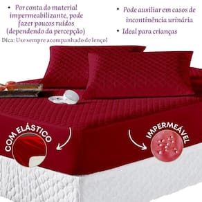 Kit Protetor Colchão Impermeável Casal +2 Capas Travesseiro Vermelho O KIT IMPERMEÁVEL MATELADO é o um combo indispensável para sua cama. O protetor e o porta travesseiros impermeável irão proteger seu colchão e travesseiro de eventuais acidentes com bebidas, líquidos, sujeira em geral e também da transpiração noturna, o que poderá proporcionar maior vida útil para seu enxoval.