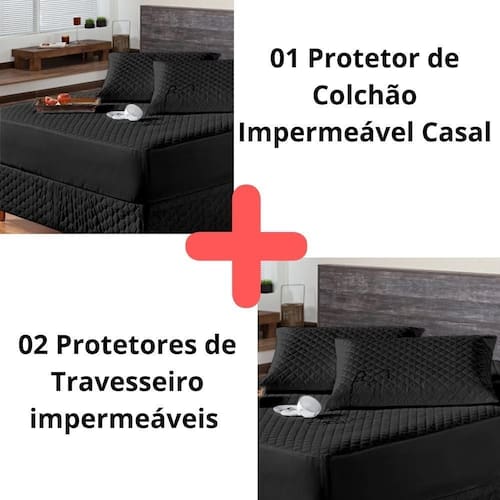 Kit Protetor Colchão Impermeável Casal +2 Capas Travesseiro Preto O KIT IMPERMEÁVEL MATELADO é o um combo indispensável para sua cama. O protetor e o porta travesseiros impermeável irão proteger seu colchão e travesseiro de eventuais acidentes com bebidas, líquidos, sujeira em geral e também da transpiração noturna, o que poderá proporcionar maior vida útil para seu enxoval.