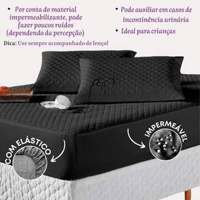 Kit protetor colchão king + 2 capa de travesseiro impermeável + saia box preto O kit impermeável matelado é o um combo indispensável para sua cama. O protetor e o porta travesseiros impermeável irão proteger seu colchão e travesseiro de eventuais acidentes com bebidas, líquidos, sujeira em geral e também da transpiração noturna, o que poderá proporcionar maior vida útil para seu enxoval.