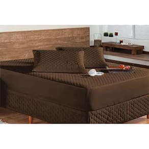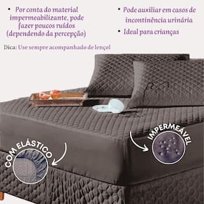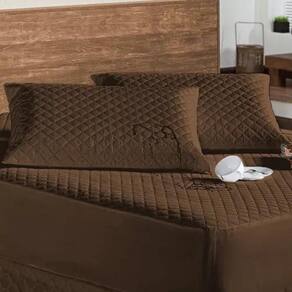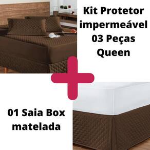 Kit protetor colchão queen + 2 capa de travesseiro impermeável + saia box marrom O kit impermeável matelado é o um combo indispensável para sua cama. O protetor e o porta travesseiros impermeável irão proteger seu colchão e travesseiro de eventuais acidentes com bebidas, líquidos, sujeira em geral e também da transpiração noturna, o que poderá proporcionar maior vida útil para seu enxoval.