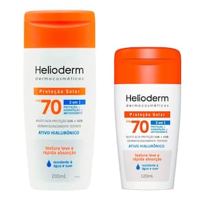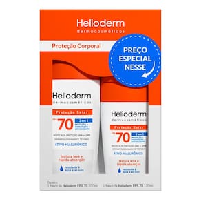 Kit Protetor Solar Helioderm FPS 70 com Ácido Hialurônico - Proteção Corporal 200ml + 120ml O Kit Protetor Solar Helioderm FPS 70 Proteção Corporal é a solução ideal para quem busca uma proteção efica