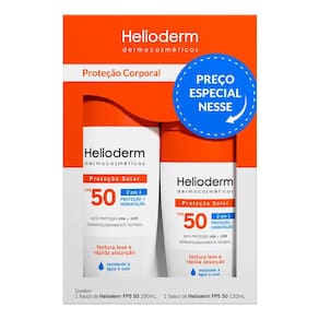 Kit Protetor Solar Corporal Helioderm Suncare FPS 50 2 Unidades 200ml + 120ml O Kit Protetor Solar Corporal Helioderm FPS50 proporciona alta proteção UVA e UVB que protege a pele dos efeitos nocivos c