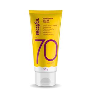 RICOSOL FACIAL FPS 70 50 G - Especialmente formulado para prevenir os sinais do envelhecimento precoce da pele causadas pelo sol. Proteção muito alta contra a radiação UVB e UVA; Rapidamente absorvido pela pele; Muito resistente à água; Contém Aloe Vera com ação hidratante CORPORAL FPS 50 200G - Uso diário. Aumenta a proteção da pele 50 vezes e é indicado para pele muito sensível a queimaduras solares. Oferece alta proteção. Ajuda a prevenir queimaduras solares causadas pelos raios UVB, além de rugas e envelhecimento precoce da pele causado pelos raios UVA. Contém proteção UVA equivalente a, no mínimo, 1/3 do FPS declarado (proteção UVB). Sua fórmula em loção Oil free de toque seco, associada à ação hidratante da Aloe Vera e antioxidante da Vitamina E, não obstrui os poros e mantém a pele saudável. Dermatologicamente testado. Formulado de maneira a minimizar possível surgimento de alergia.