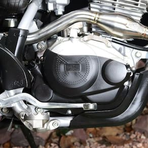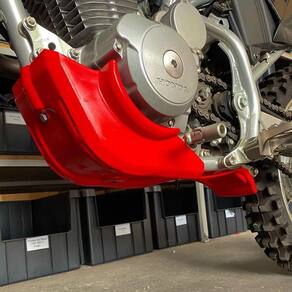 Protetor Motor, tem como função proteger as partes mais importantes da moto como as tampas laterais do motor, chassi inferior, chassi frontal, link da suspensão traseira, motor e suporte da pedaleira contra batidas de galhos, pedras, troncos e eventualmente uma queda.