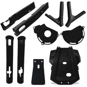 Protetor Motor, tem como função proteger as partes mais importantes da moto como as tampas laterais do motor, chassi inferior, chassi frontal, link da suspensão traseira, motor e suporte da pedaleira contra batidas de galhos, pedras, troncos e eventualmente uma queda.