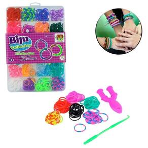 KIT Pulseiras Elástico Collection Biju Box - Kit com elásticos Box para montar pulseiras e tornozeleiras coloridas;\n- Contém: Aproximadamente 750 elásticos, Fechos em plástico, 1 Ferramenta em Y, 1 Ferramenta de Gancho;\nEspecificações:\nMarca : DM BRASIL\nTipo de material : Elástico\nCores ou Estampa : Colorido\nDimensões do Produto : 19,2 X 13,4 X 1,8 CM\nDimensões da Embalagem : 19,2 X 13,4 X 1,8 CM\nPeso Bruto (Gramas) : 0.117