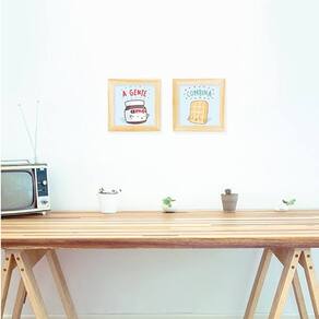 Dimensões: 17,5 cm x 17,5 cm x 2 cm Cada Peso: 0,200 kg - Kit Cores: Moldura Cru - Poster com estampa em diversas cores Material: Moldura de madeira - Poster PaperGloss 230gr. Conservação: Pano seco. Fixação: Na parede, atravéz de fita dupla face que acompanha o produto. Ou também fica em pé sobre a bancada.