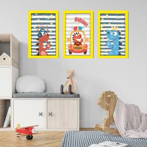Kit Quadros Infantil Dinossauro Kids 20x30 3 Peças Titulo Moldura Amarela