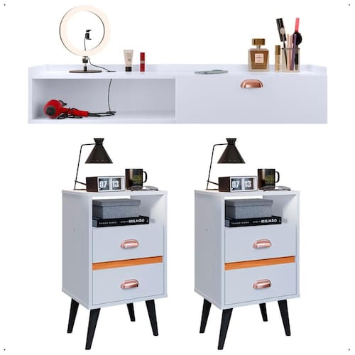 O Kit Quarto é composto pela Mesa de Cabeceira Classic e pela Penteadeira Suspensa Decor, unindo beleza, sofisticação e praticidade para deixar seu ambiente ainda mais organizado e aconchegante.