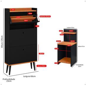 A Mesa de Cabeceira conta com uma prateleira suspensa e um nicho aberto, atributos essenciais para exibir objetos decorativos ou organizar itens de uso diário. Já a Sapateira possui gavetas basculantes com amplo espaço para a organização de calçados, mantendo tudo em seu devido lugar.