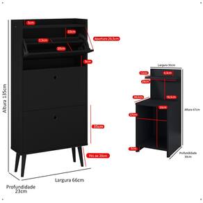 A Mesa de Cabeceira conta com uma prateleira suspensa e um nicho aberto, atributos essenciais para exibir objetos decorativos ou organizar itens de uso diário. Já a Sapateira possui gavetas basculantes com amplo espaço para a organização de calçados, mantendo tudo em seu devido lugar.