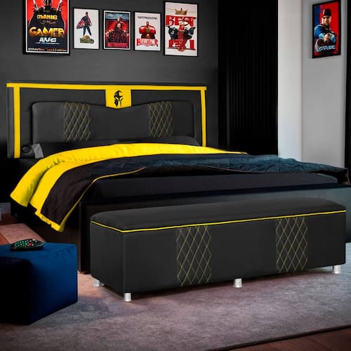 kit Fighter Para Quarto Gamer 160cm - Sofa StoreTransforme seu quarto em um verdadeiro setup gamer completo com o Kit Gamer Fighter, que une cabeceira com Entrada USB e Tipo C integrada + baú organizador em um único combo de estilo, tecnologia e organização.Produzido em corino premium, com emblema bordado exclusivo e acabamento temático, o kit deixa sua cama box queen 160cm muito mais imponente e funcional.Carregue celular, controle e headset direto na cabeceira, sem fios espalhados, enquanto o baú mantém todo seu setup, roupas e acessórios sempre organizados.Ideal para quem quer quarto gamer estiloso, sem bagunça, com mais conforto e praticidade no dia a dia.Kit Gamer Fighter: mais imersão, mais organização e muito mais estilo no seu setup!CARACTERÍSTICAS DO PRODUTO:- Estofamento: Espuma D26;- Revestimento: Corino;- Material da Estrutura: Madeira de eucalipto de reflorestamento;- Pés em PVC;- Modelo retangular, tendência nos lares e comércios!DIFERENCIAIS:- Produto de alta qualidade;- Design moderno;- Costura resistente;- Estrutura segura;- Para a limpeza, recomendamos utilizar pano levemente úmido e detergente neutro.DIMENSÕES BAÚ:Fechado:Largura: 160 cmAltura: 45 cmProfundidade: 45 cmPeso: 26 kg.Aberto:Largura: 152 cmAltura: 30 cmProfundidade: 38 cmDIMENSÕES DO PAINEL: Largura: 160 cmAltura: 60 cmProfundidade: 7 cmPeso: 7 kgVOLUMES, MONTAGEM E GARANTIA:- As duas peças chegaram na mesma embalagem;- O produto chegará montado, sendo necessário apenas rosquear os pés;- Garantia do fabricante: até 90 dias corridos após o recebimento, contra defeitos de fabricação;INFORMAÇÕES IMPORTANTES:- A entrega do produto é realizada em todo território nacional, até onde as rodovias alcançam.- Objetos decorativos que aparecem na foto não acompanham o produto;- Pode haver diferença de tonalidade entre a imagem e o produto real, por conta de lote de tecido, tratamento de imagens e a calibração de cores do seu monitor;- Por se tratar de estofado as medidas podem ter uma variação em até 3 cm;- Confira as dimensões do produto e certifique-se de que passará normalmente por elevadores, portas, escadas e/ou corredores de sua residência, já que nossa entrega não inclui a subida de lances de escada, ou o içamento de produtos;