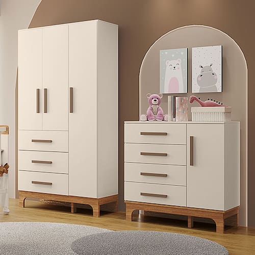 O Kit Quarto Infantil Doçura oferece uma solução prática e charmosa para quem busca organização e qualidade no dia a dia com o bebê. Com design moderno e estrutura resistente, este conjunto une o Guarda-Roupa e a Cômoda da linha Doçura, ideais para manter tudo sempre em ordem, com segurança e visual aconchegante.