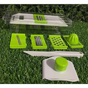 O ralador de legumes de plástico é um utensílio de cozinha feito e projetado para ralar ou fatiar legumes e outros alimentos. Ele possui 8 peças entre lâminas, raladores, triturador e espremedor. Com ele você pode ter diferentes tamanhos e formas de ralados ou fatiados.