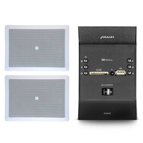 O sistema é centrado em um amplificador de parede discreto e moderno, projetado para ser embutido em caixas de tomada padrão, otimizando o espaço e mantendo a estética do local. Este módulo amplificador oferece conectividade multicanal através de recursos modernos, como conexão sem fio de longo alcance, entradas para dispositivos de armazenamento (pen drives e cartões de memória), além de rádio FM e entrada auxiliar para conectar aparelhos externos. Sua potência é dimensionada para alimentar o conjunto de caixas de forma eficiente, sendo controlado de maneira conveniente por um controle remoto ou através de um aplicativo dedicado.
