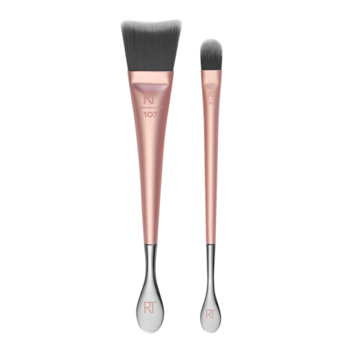 Kit com pincel e espátula para o rosto e olhos. Kit Real Techniques Skincare Brush Duo é ideal para ajudar na aplicação de produtos de cuidados com a pele.