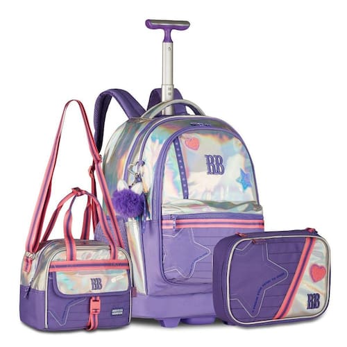 Um conjunto sofisticado e funcional para acompanhar a rotina escolar. A mochila RB27016, em PVC holográfico, traz design único com bordado de estrela, patches frontais, divisória para notebook e tablet, dois compartimentos frontais, bolsos laterais e chaveiro triplo exclusivo, além da cartela de adesivos Rebecca Bonbon. Pode ser Utilizado no carrinho ou como mochila de costas, com proteção para rodinhas e alças acolchoadas. Dimensões aproximadas: 48x35x19cm. A lancheira RB27018, também em PVC holográfico, é prática e versátil, com amplo espaço interno, revestimento térmico, bolso frontal extra e três opções de uso: alça de mão, alça de ombro ou alça carona para acoplar na mochila. Dimensões aproximadas: 20x24x14cm. O estojo RB27019 completa o kit com organização total: possui 36 elásticos internos, compartimento extra com fechamento em zíper e capacidade para até 100 lápis ou canetas. Dimensões aproximadas: 22x14x6cm. Um kit completo, cheio de charme holográfico e praticidade para o dia a dia. Marca: Não Informado