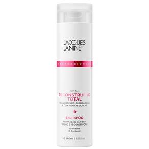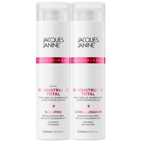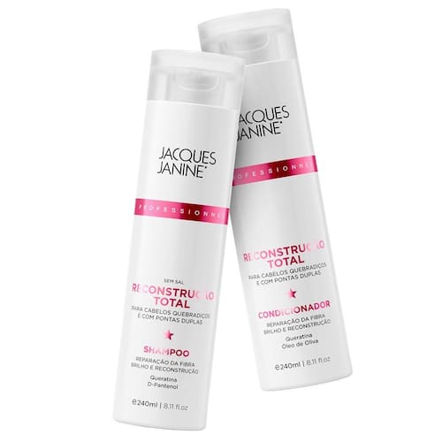 Jacques Janine - Shampoo + Condicionador Reconstrução Total 240mlIdeal para cabelos quebradiços e com pontas duplas. Repõe as proteínas nos fios frágeis e sensibilizados, deixando os cabelos fortes e com vitalidade. O condicionador, além de desembaraçar, promove a reparação e reconstrução das fibras capilares, protegendo os cabelos contra a quebra e novas agressões.- Hidratação intensa;- Reparação total da fibra;- Resistência e brilho extra.Sugestão de uso:1 - No cabelo molhado, aplique uma porção generosa do Shampoo Reconstrução Total;2 - Massageie com as pontas dos dedos em movimentos circulares e enxágue bem;3 - Espalhe o Condicionador em suas mãos e aplique sobre os cabelos úmidos, massageando do comprimento até as pontas;4 - Deixe agir de 3 a 5 minutos, enxágue completamente e finalize como desejar.O que você está comprando01 - Shampoo Reconstrução Total Jacques Janine - 240ml;01 - Condicionador Reconstrução Total Jacques Janine - 240ml.ANVISAShampoo 25351.390338/2018-21;Condicionador 25351.362786/2018-34.Não testado em animais;Imagens meramente ilustrativas.