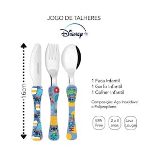 -1 Jogo de Talheres Infantil em Aço Inox Stitch Disney incluso: 01 Garfo, 01 Colher e 01 Faca 15cm (PP e Aço Inox)