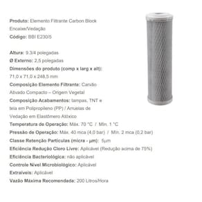Dimensionais: Altura: 248mm Diâmetro externo: 70mm Diâmetro interno: 28mm Grau de filtração: 5 micra Redução de partículas: classe III Elemento Filtrante Carbon block Encaixe 9.3/4'' para filtro bbi POU230