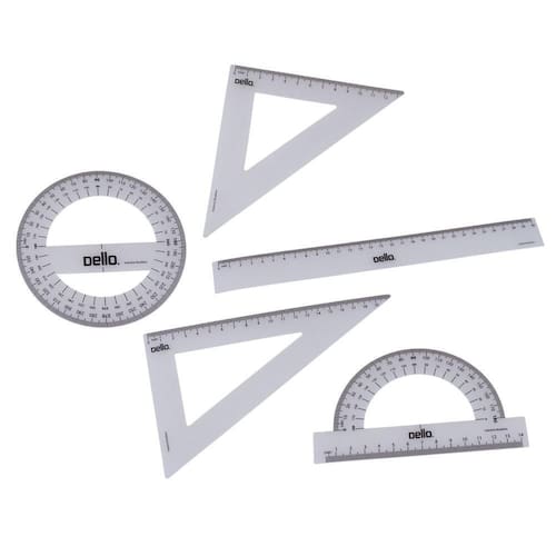 O Kit de réguas Dello é completo para desenho escolar 1º e 2º grau. É composto por 01 Régua de 30cm , 01 Transferidor 180°, 01 Transferidor 360°, 01 Esquadro 60°, 01 Esquadro 45°. São produzidos em chapa PP laminada flexível. Tudo de forma prática para o seu dia-a-dia.