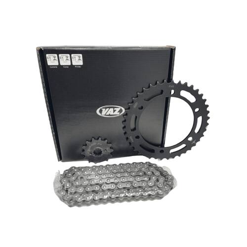 Embalagem: 01 Kit Transmissão Completo. ( Coroa, Pinhão e Corrente )