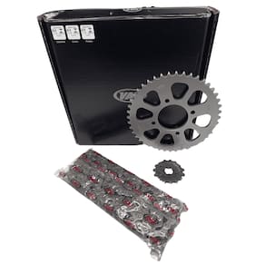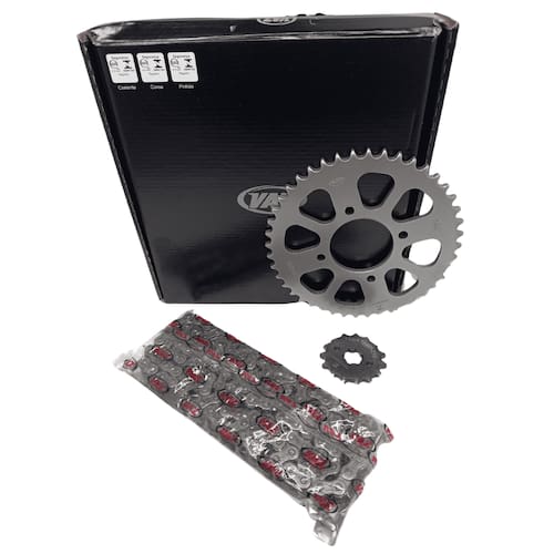 Embalagem: 01 Kit Transmissão Completo. ( Coroa, Pinhão e Corrente )