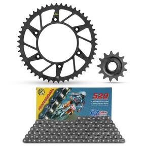 Especificações técnicas: Peso do kit: 2,879kg. Dentes da coroa: 50. Dentes do pinhão: 13. Elos da corrente: 118. Passe da corrente: 520h.