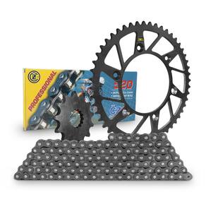 Especificações técnicas: Peso do kit: 2,930kg. Dentes da coroa: 50. Dentes do pinhão: 13. Elos da corrente: 118. Passe da corrente: 520h.