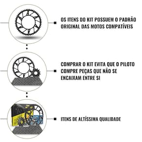 Além de evitar que você perca tempo e dinheiro com peças que não se encaixam perfeitamente entre si, os itens desse kit também possuem o padrão de fábrica das motos compatíveis, garantindo excelente custo-benefício.