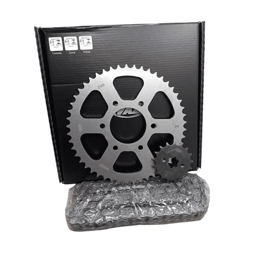 Embalagem: 01 Kit Transmissão Completo. ( Coroa, Pinhão e Corrente )