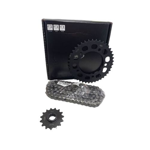 Embalagem: 01 Kit Transmissão Completo. ( Coroa, Pinhão e Corrente )
