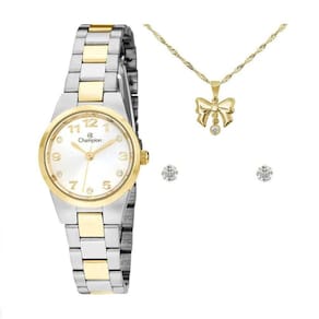 Características Nome Curto Kit Relógio Champion Feminino com Colar e brincos Referência/SKU CH26846B Formato da Caixa Redondo Marcas Champion Gênero Feminino Cor Bicolor Tamanho da Caixa Pequeno Material da Pulseira Aço Mecanismo Analógico Comprimento do Relógio 20 cm Pulseira Ajustável Sim Material da Caixa Metal Espessura da Caixa 0,9 cm Dimensões da Caixa 2,4 cm de diâmetro Material do Vidro Cristal Mineral Nível de Resistência à Água 5 ATM Calendário Não tem CalendárioAcompanha colar e brincos. Imagem meramente ilustrativa. Podendo variar