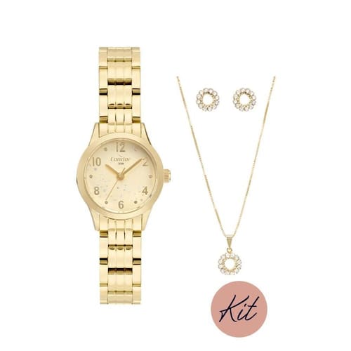 Kit Relógio Condor CO2035NBJ/K4X Dourado CO2035NBJ K4X KIT Relógio de Pulso CO2035NBJ/K4X Dourado Caixa em Metal Pulseira em Aço Inox 5 Atm - 50 Metros Resistência dágua Fundo em Aço - Pressão Fecho 2 Botão Lateral Largura da Caixa: 25 mm Largura da Caixa com Coroa: 27,6 mm Espessura da Caixa: 8,8 mm Largura da Pulseira : 12 mm Acompanha Estojo kit Condor Gargantilha Semi-Jóia Par Brinco Semi-Jóia Manual de Instrução com Certificado de Marca: Não Informado