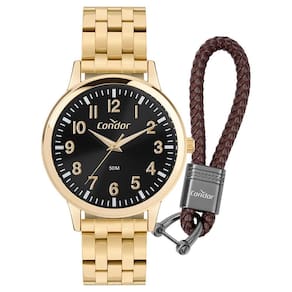 Elegância e praticidade se unem neste kit Condor masculino, ideal para o dia a dia. O relógio conta com um visual moderno e funcional, com caixa de 40mm em metal dourado, mostrador preto e marcadores numéricos de fácil leitura. A pulseira dourada em aço inoxidável garante um acabamento refinado e excelente durabilidade.