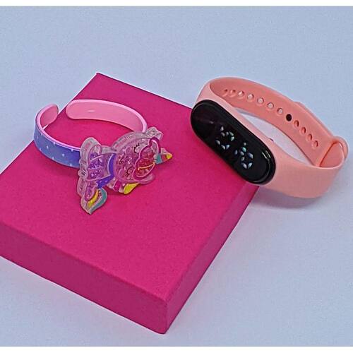 Kit Relógio Digital Led Touch Prova água Menina Esporte + Bracelete Pulseira Infantil 3D desenho animado Presente - Cor: Rose