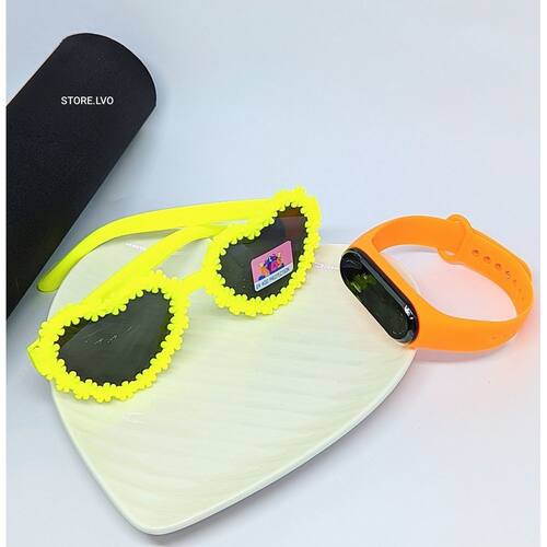 Kit Relógio Digital Meninas Toutch Led Prova água Silicone + Óculos de Sol Coração Menina Flor Florzinha Flexível Moda - Cor: Laranja