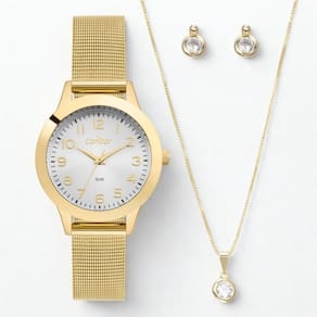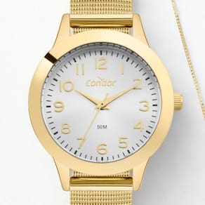 A Coleção Kit Dia a Dia da Condor é o Par Perfeito para te acompanhar. Com pulseira em aço inoxidável mesh, seu mostrador está disponível em prata, com resistência à água de 50m e banho dourado. Destaque para o conjunto de semijoias encantadoras, garantindo uma combinação perfeita em todos os momentos.
