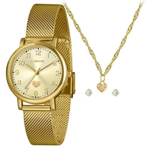 A pulseira mesh em aço dourado traz conforto e um visual contemporâneo, enquanto o mecanismo analógico em quartz assegura precisão no uso diário. O kit acompanha colar e brincos, compondo um conjunto completo que valoriza ainda mais a proposta do modelo.