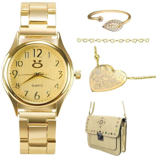 Especificações Técnicas: - Relógio analógico feminino banhado a ouro 18K - Pulseira resistente em aço inoxidável - Tampa blindada com arte de coração exclusiva - Colar banhado com pingente em forma de coração e arte gravada à laser - Pulseira banhada com vários pingentes em forma de coração - Anel banhado versátil e ajustável para qualquer tamanho de dedo - Caixa premium Orizom Maria para armazenar os acessórios - Bônus especial: bolsa tiracolo imagem meramente ilustrativa, detalhes podem variar - Embalagem pronta para presente