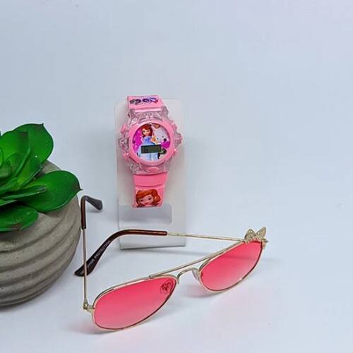Kit Relógio Infantil Digital Pisca Luz Led Toca Musical Menina Frozen Barbie + Óculos de Sol Aviador com Lacinho Armação Aço Crianças